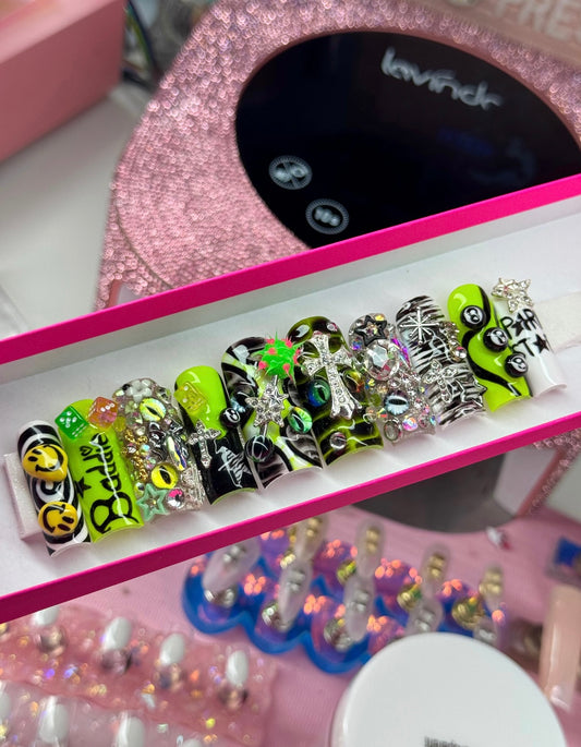 Acrylic Cute Baddie Press On Nails Black & Green 3D Stargirl