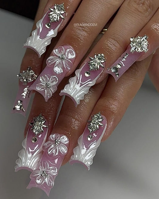 Acrylic Baddie French Tips Bling & 3D Flowers