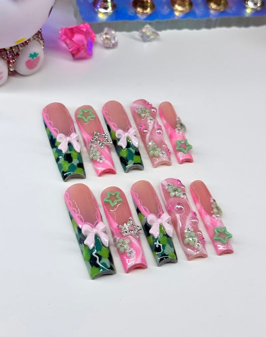 Acrylic Cute Y2K Baddie Camo Green & Pink Press On Nails