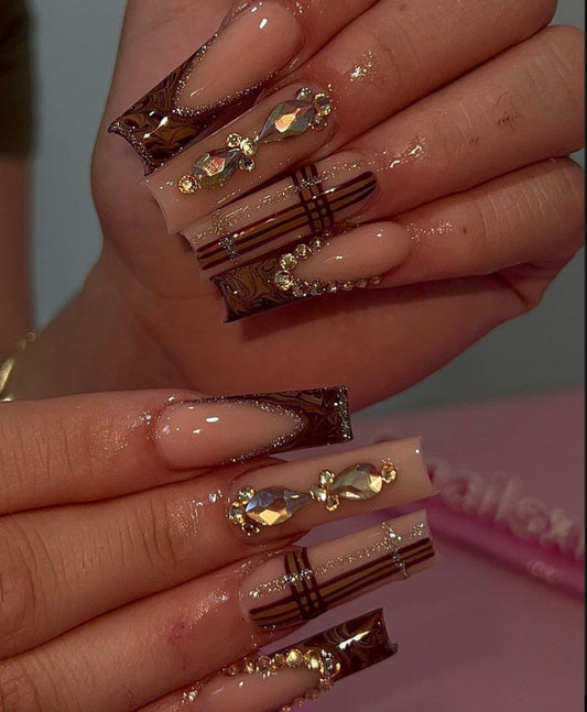 Acrylic Baddie Fall/Autumn Bling Press On Nails Brown & Gold