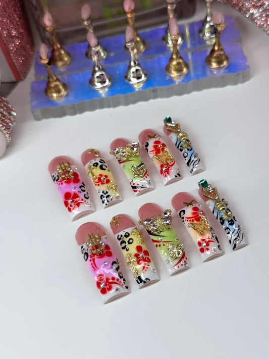 Acrylic Baddie French Tip Colorful Press On Nails Bling & Flowers