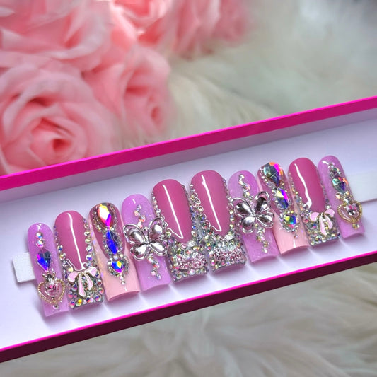Acrylic Baddie Bows & Bling Pink Coquette Press On Nails