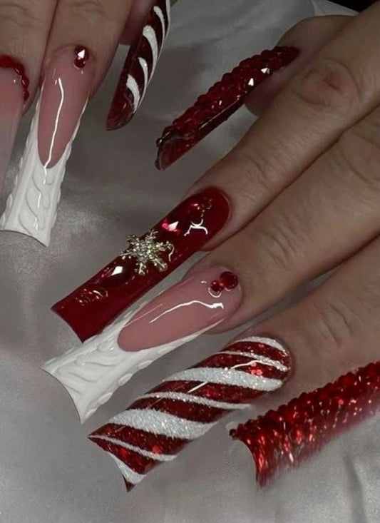 Acrylic Baddie Christmas Red & White Snowflakes & Sweater Press On Nails