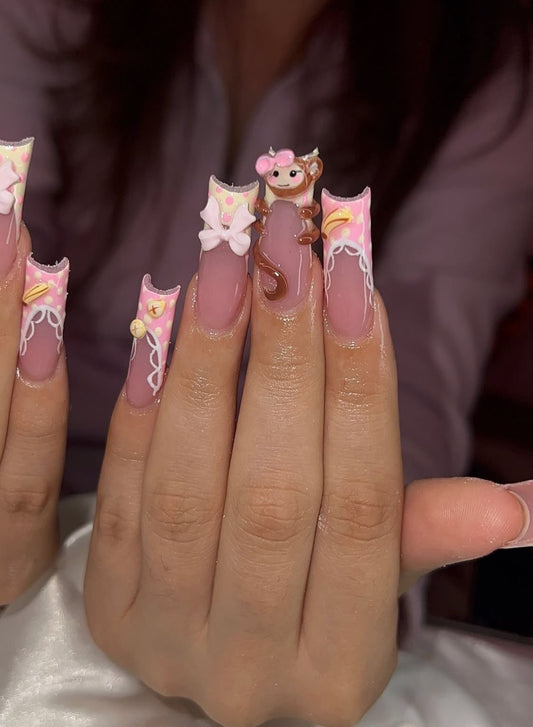 Baddie Pink & Yellow 3D Monkey Acrylic Press On Nails