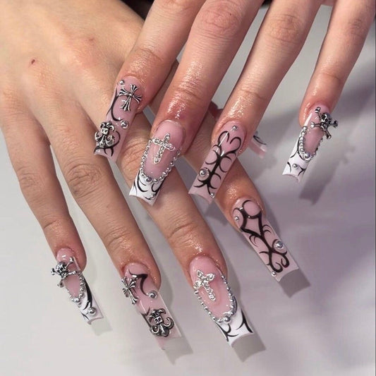 Luxury Baddie Cyber French Tips Acrylic Cross Punk Press On Nails