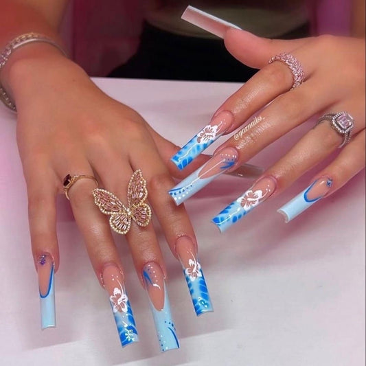 Luxury Acrylic Hibiscus Baddie Blue Spring French Tip Press On Nails