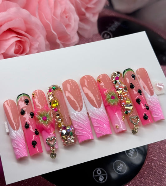 Luxury Baddie Pink 3D Watermelon Flowers Acrylic Press On Nails