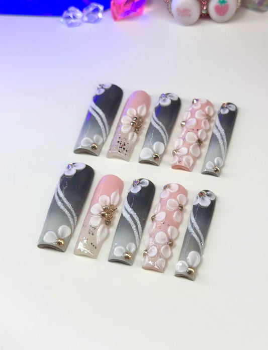 Baddie Acrylic Press On Nails Pretty Cute Gray 3D Flowers & Bling