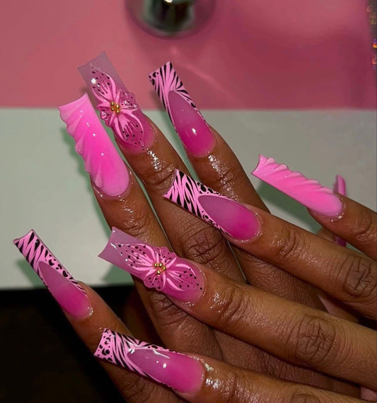 Baddie Luxurious Acrylic Pink Animal Print 3D Gel Flower Press On Nails