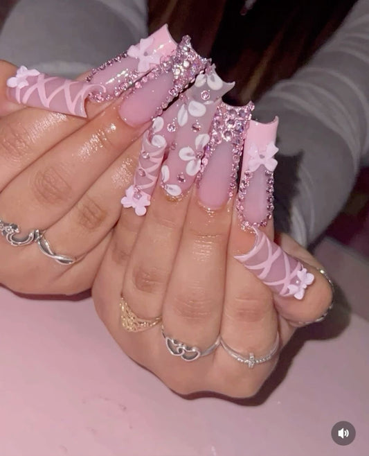 Baddie Pink Acrylic Press On Nails 3D Flowers & Pearls