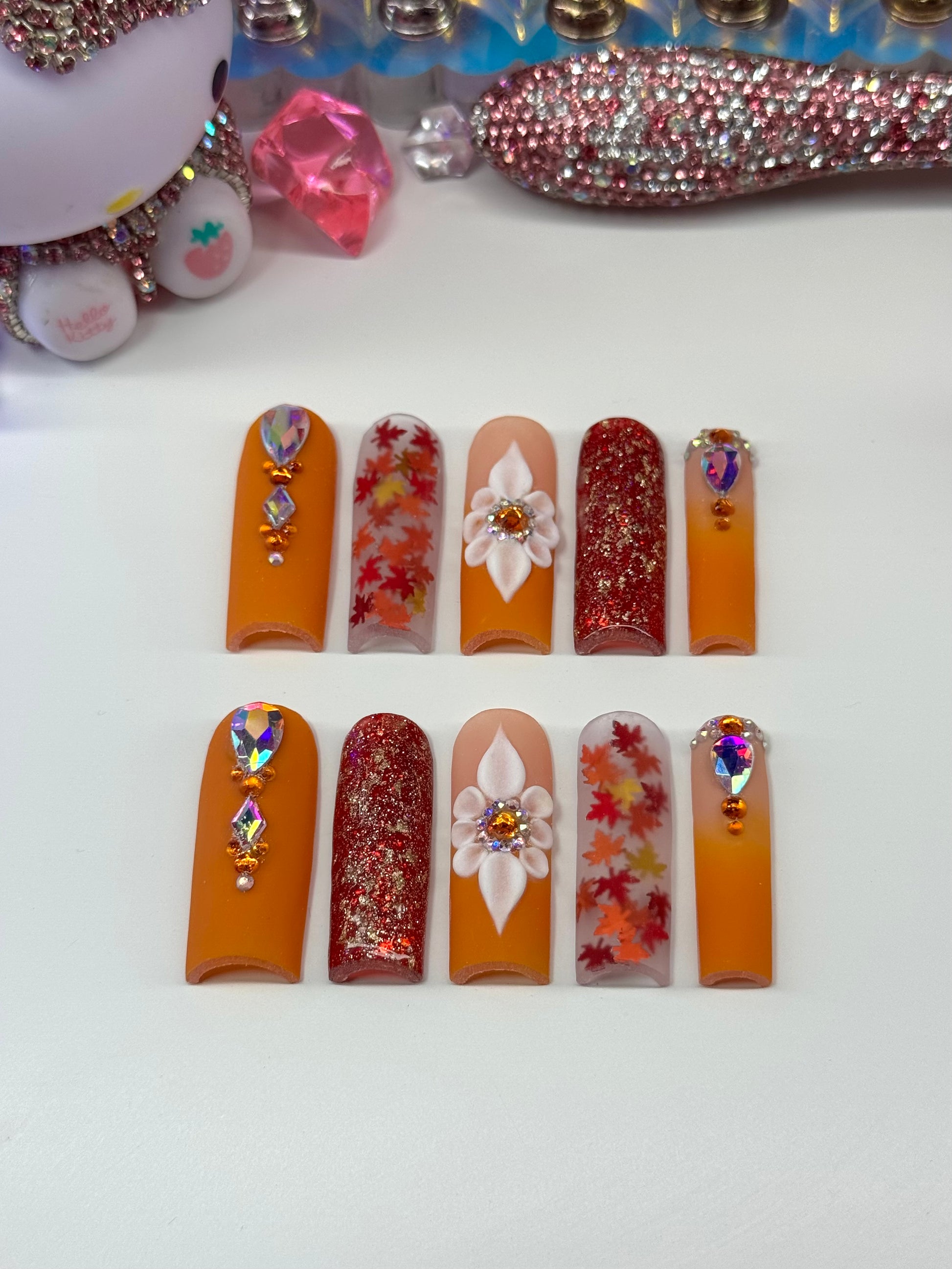 Acrylic Fall Bling Orange Leaves Matte Press On Nails